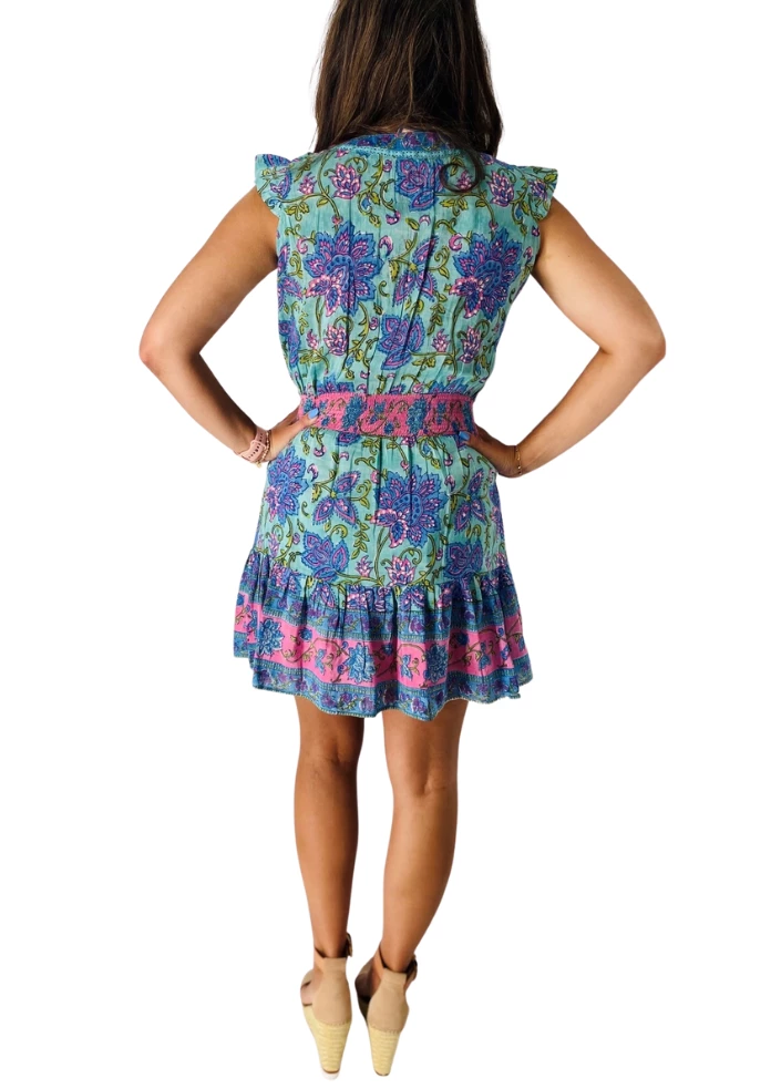Our best selling dress is back in a new green and pink floral print! The cotton silk is lightweight and with a slight ruffle on the shoulder and pink tassels, this slimming dress is an instant favorite for warmer weather. Made in India.
