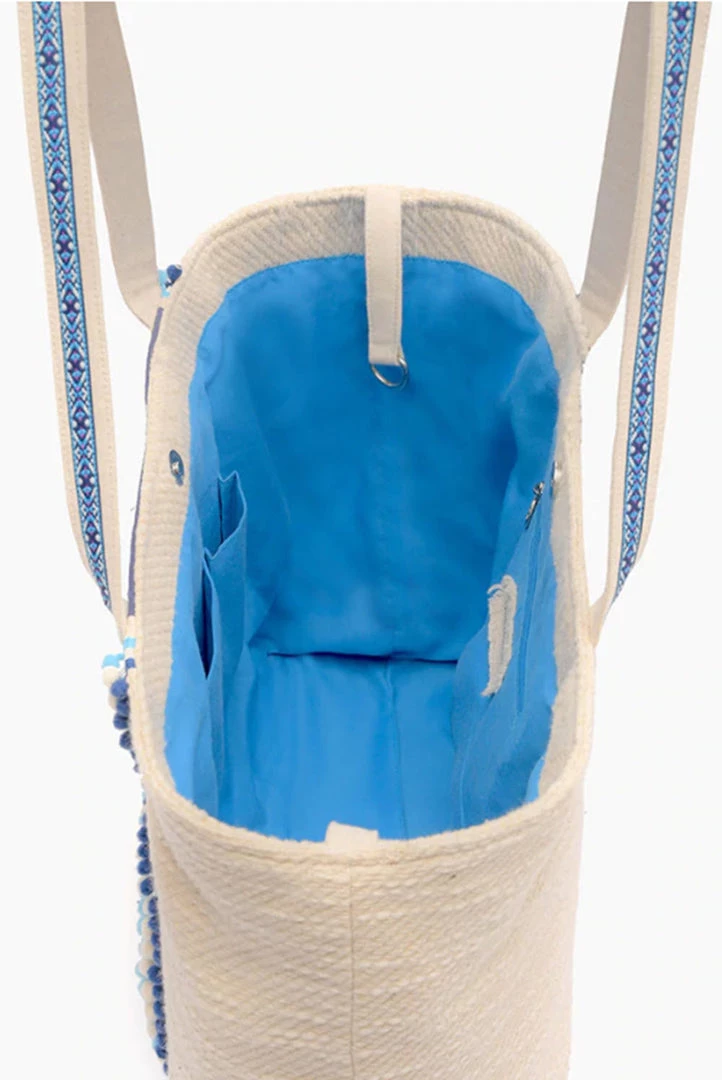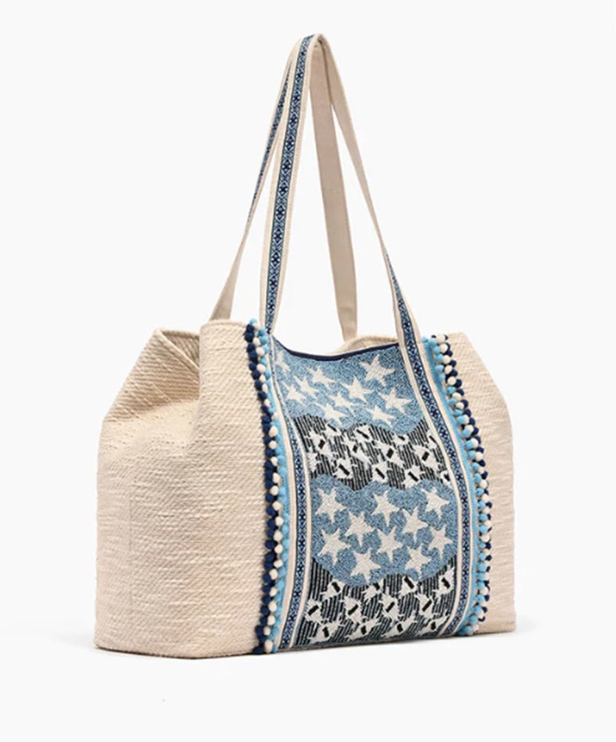 This multi-purpose hand beaded embellished tote is sure to leave you starry eyed. Double shoulder straps with lace and pom pom detailing, lined interior with zip pocket, and pocket organizers.