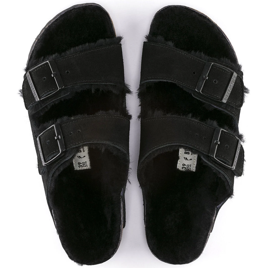 Suede upper, shearling footbed lining, rubber sole. Narrow Birkenstock width.