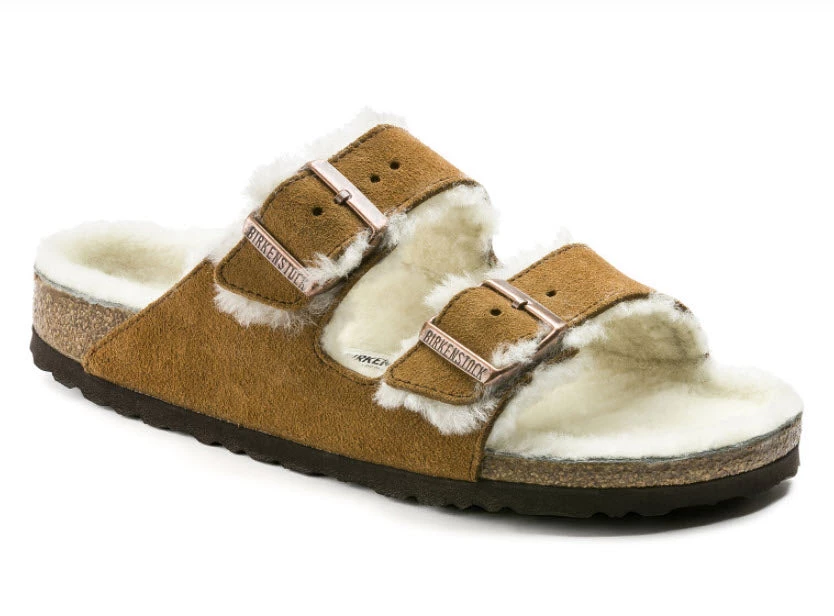 Suede upper, shearling footbed lining, rubber sole. Narrow Birkenstock width.