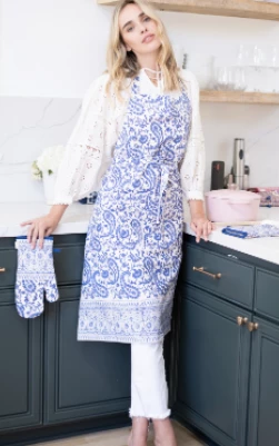 Prep, cook, bake, or entertain in style with this hand block printed apron and mitt set. Perfect to give as a gift or treat yourself!