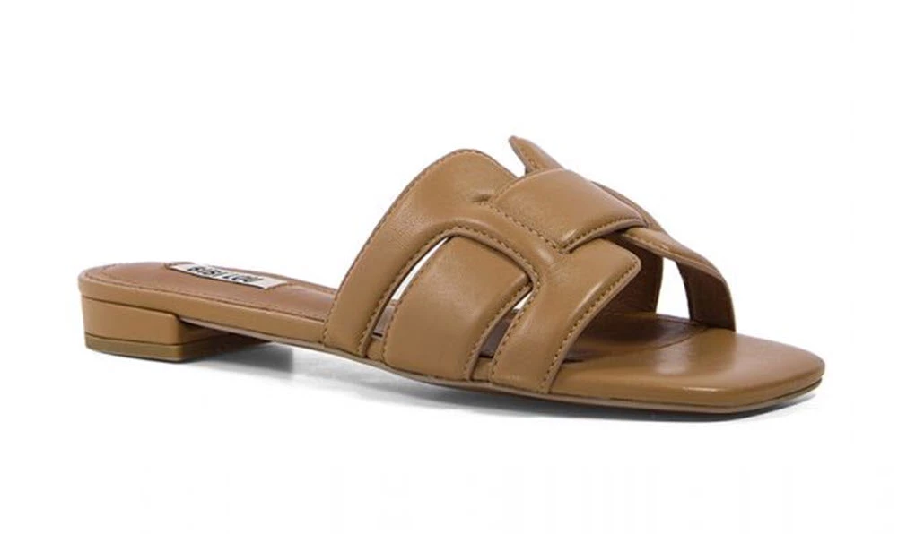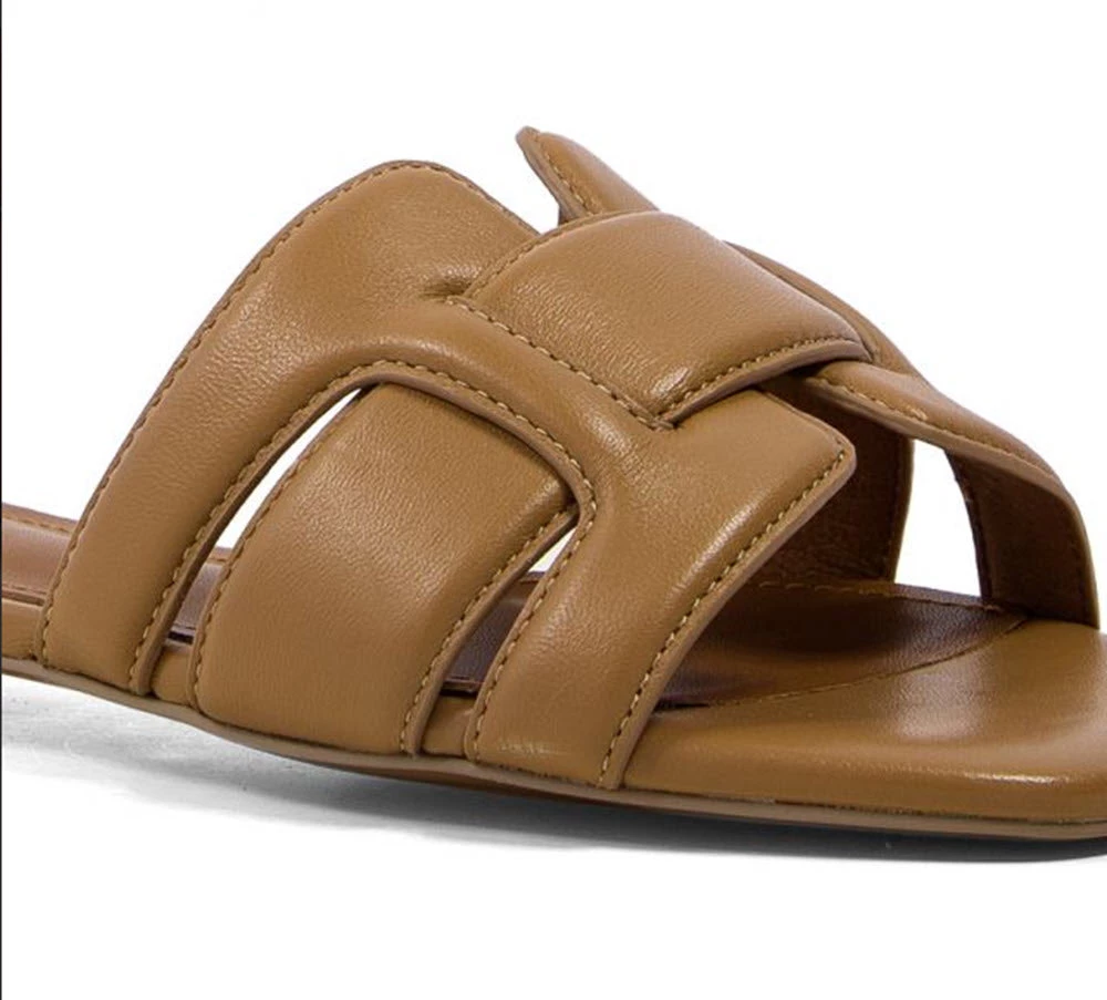 Beautiful leather square toe slides with interlocking detailing on strap. Heel 1/2 inch.