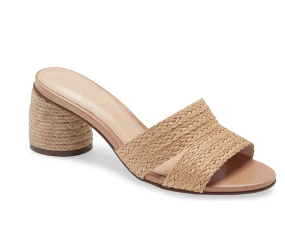 This stylish braided raffia strap and wrapped heel sandal is perfect for the warmer weather. Raffia upper, leather lining, and synthetic sole. Heel 2 3/4 inches.