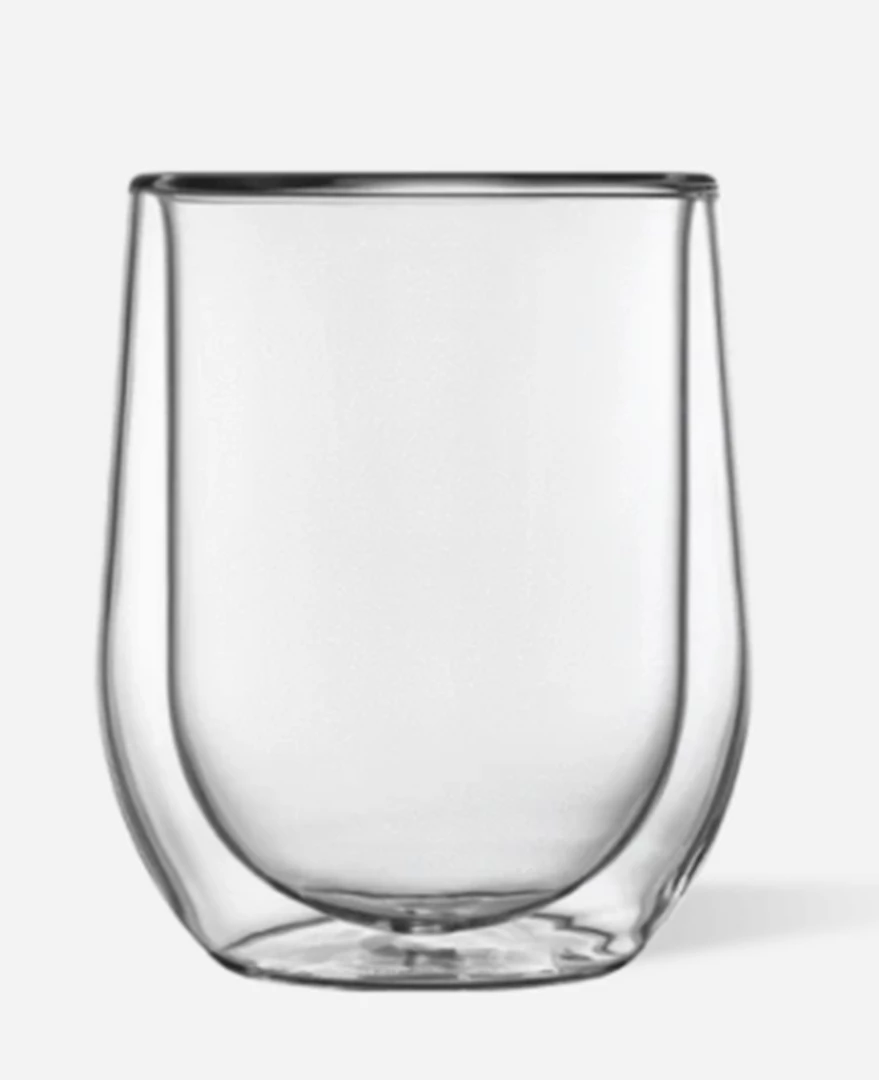Boxed 2 pc stemless insulated glass set in clear. Makes a great gift and a new addition to your bar cart. Crafted with lightweight yet durable double-walled glass that’s hot and cold ready.