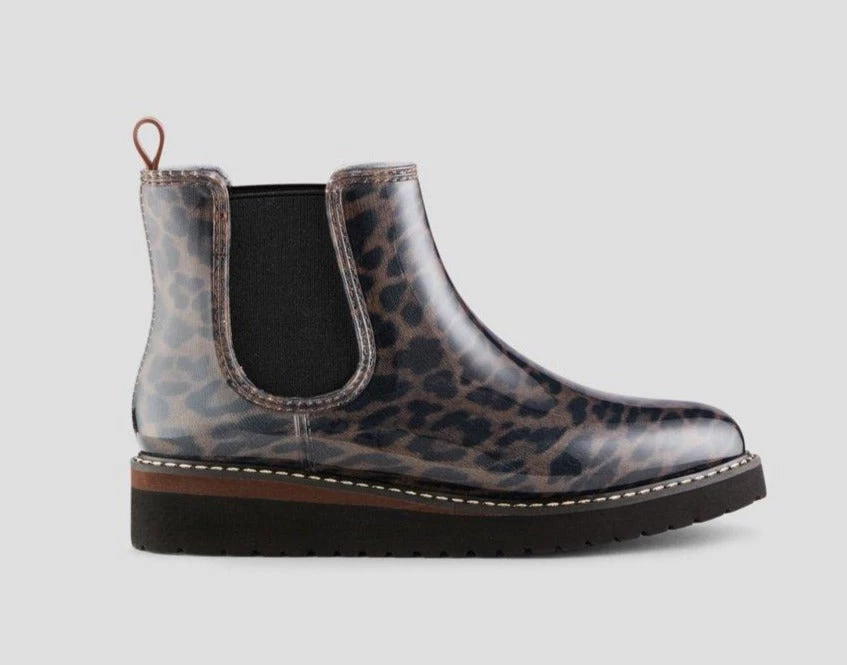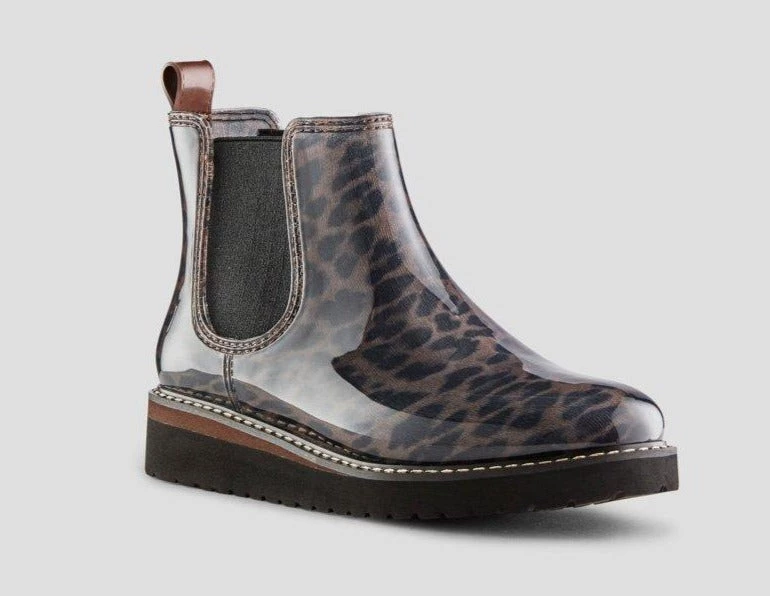 A rain boot never looked or felt this good. Ankle-high glossy leopard print double gored bootie with anti-slip EVA outsole & contrast welt treatment. Whole US sizes only. If you are a 1/2 size recommend the next full size.