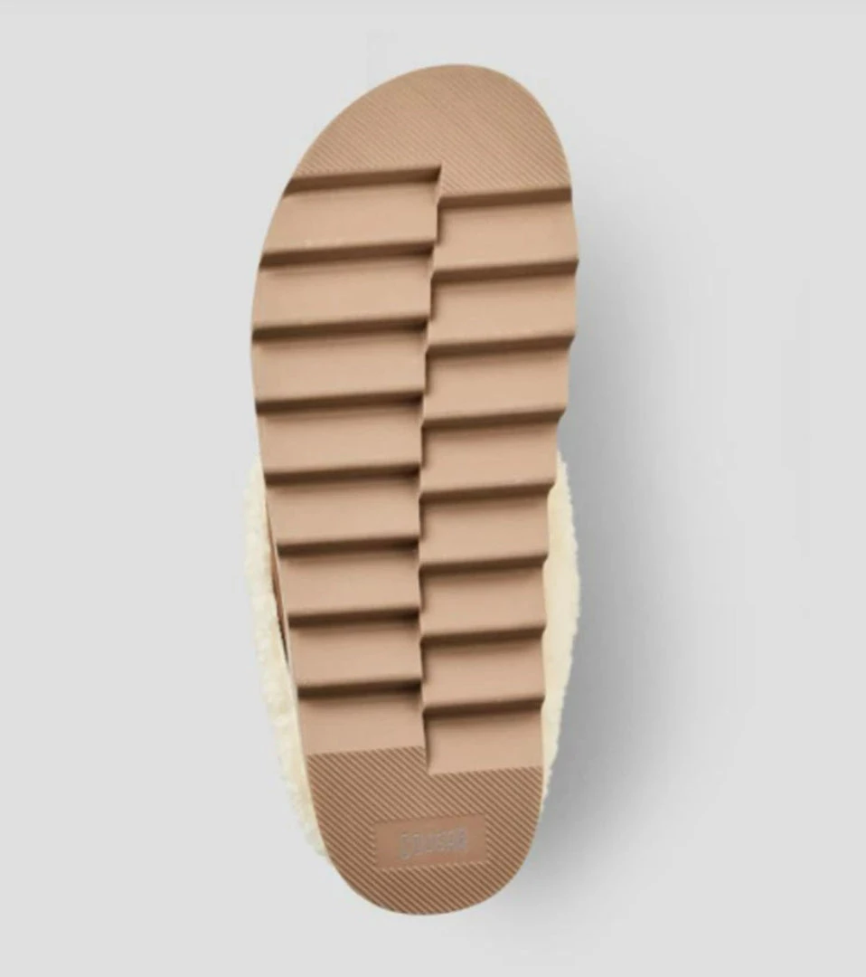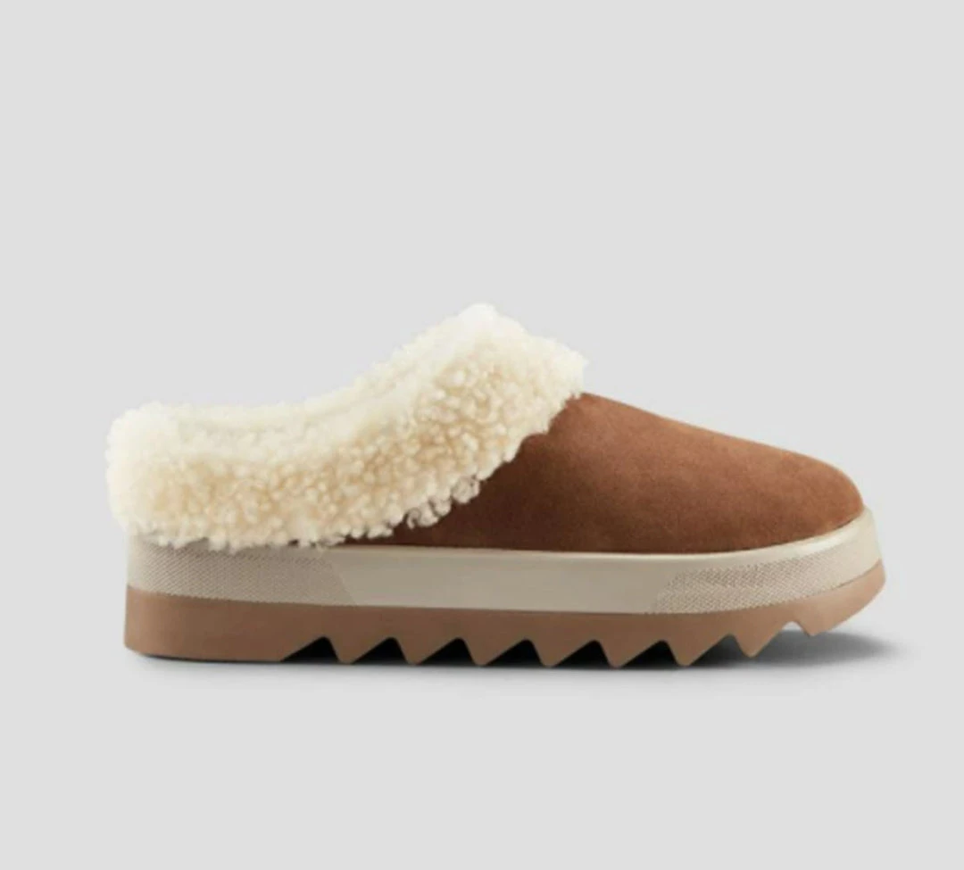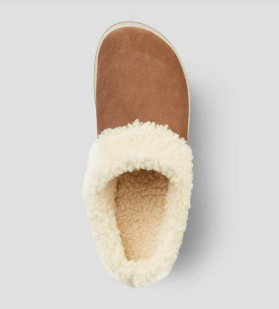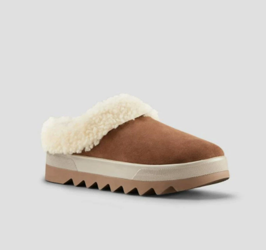 Slip into this waterproof curly shearling and suede mule. Anti-slip EVA outsole. If you are a 1/2 size, next whole size up recommended.