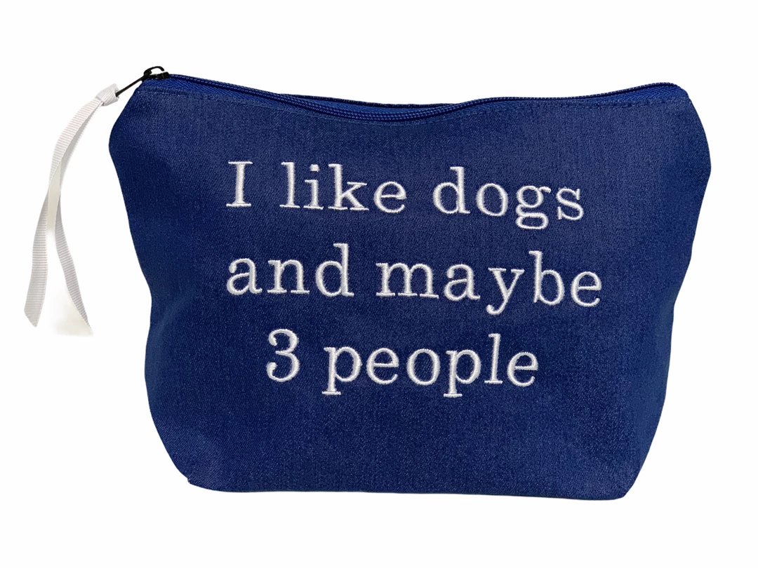 The “I Like Dogs and Maybe 3 People” Pouch in Denim. L 10″ x W 7″ x D 3″