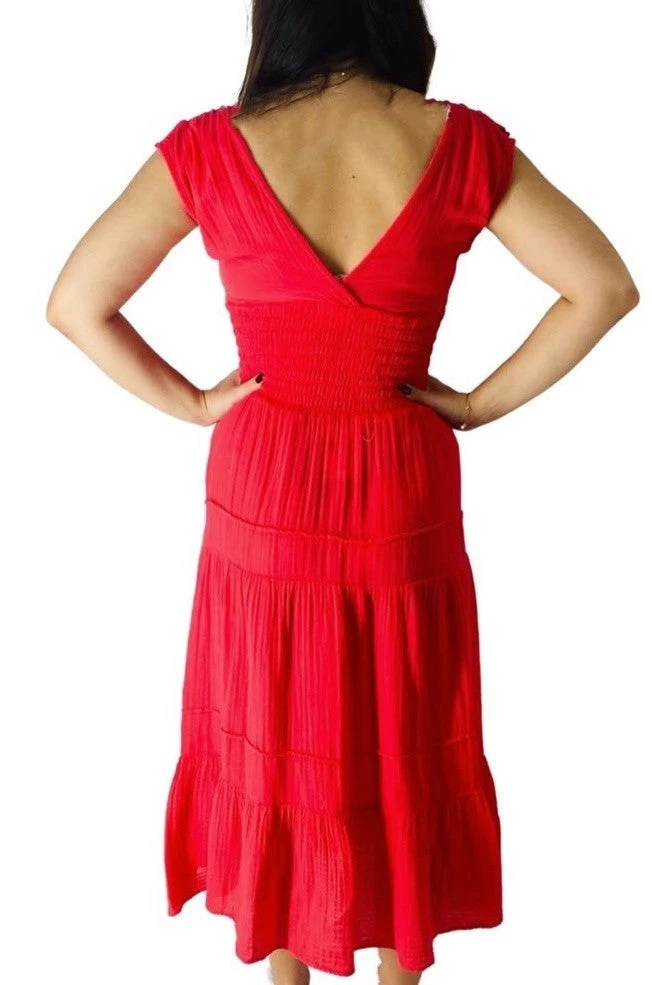 The most flattering lightweight cotton gauze maxi there is! This smocked waist dress has a deep V-neck on both the front and back. Fitting true to size, it can be worn dressed up with sandals or dressed down over your bathing suit. Also comes in other colors. Made in the USA.