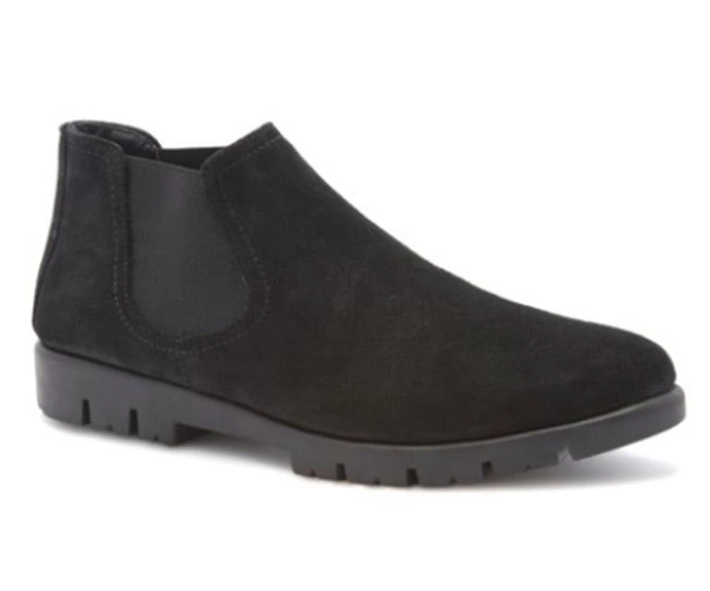 Suede ankle boot with wide elastic insets on the side for a more custom fit and easy on and off. Cushioned footbed with suede upper.