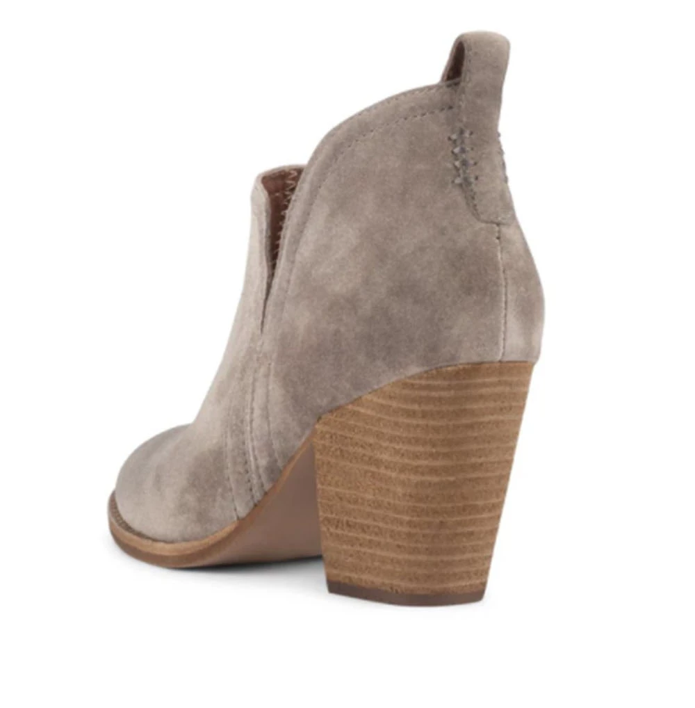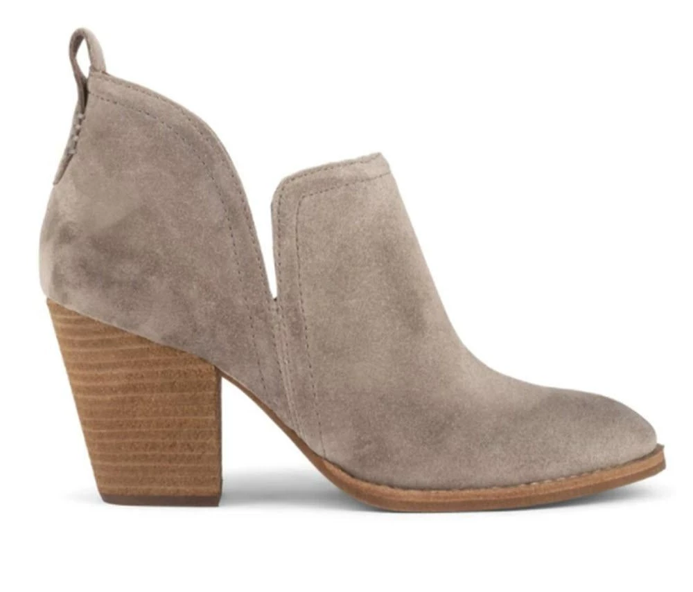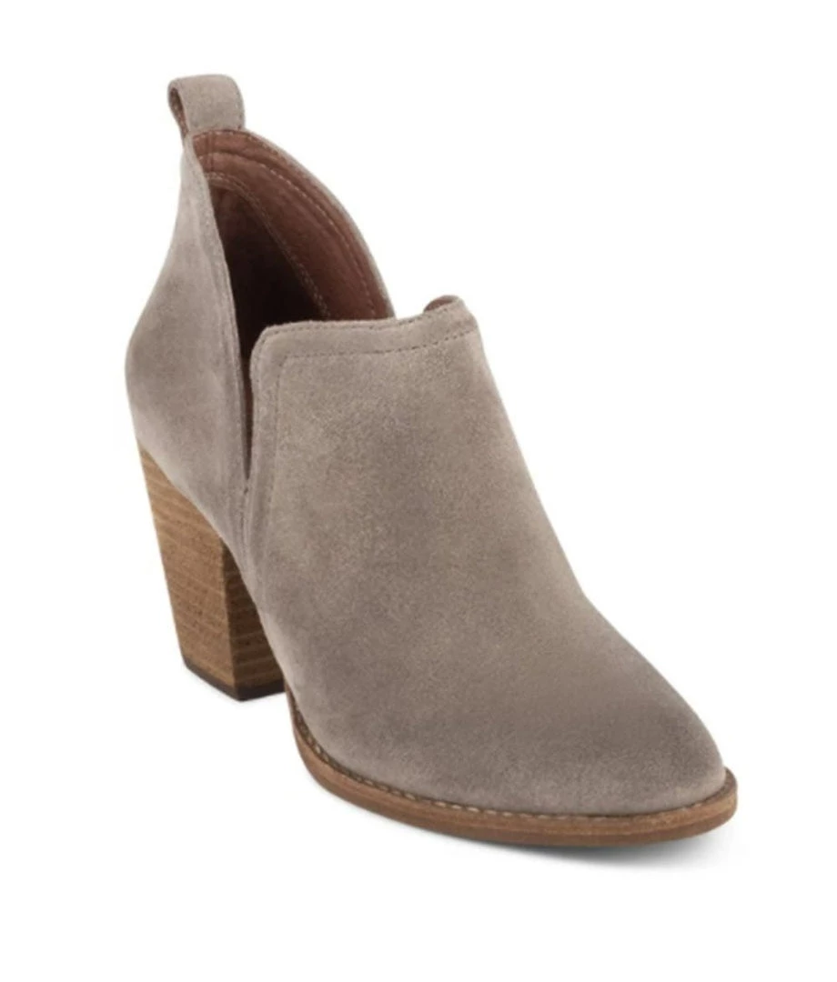 Chunky stack heeled suede bootie with pull tab for easy wear, almond toe, and side cuts. Suede upper, leather lining, and synthetic sole. Heel height 3 inches.