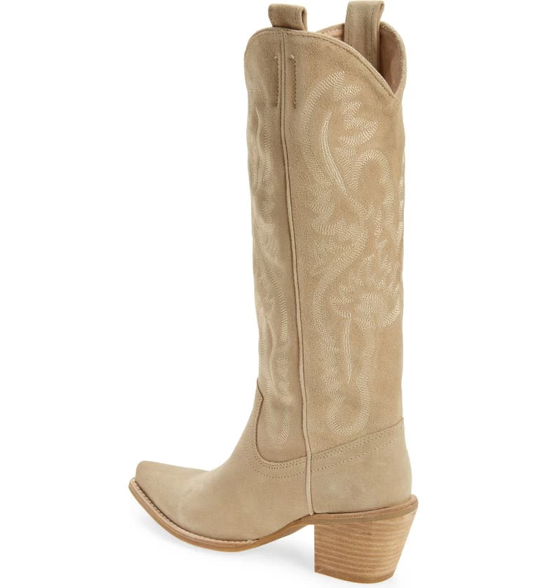 Mid-calf heeled western boot with ornate stitching. Suede upper, leather lining, and synthetic sole. Heel height 2.5 inches.