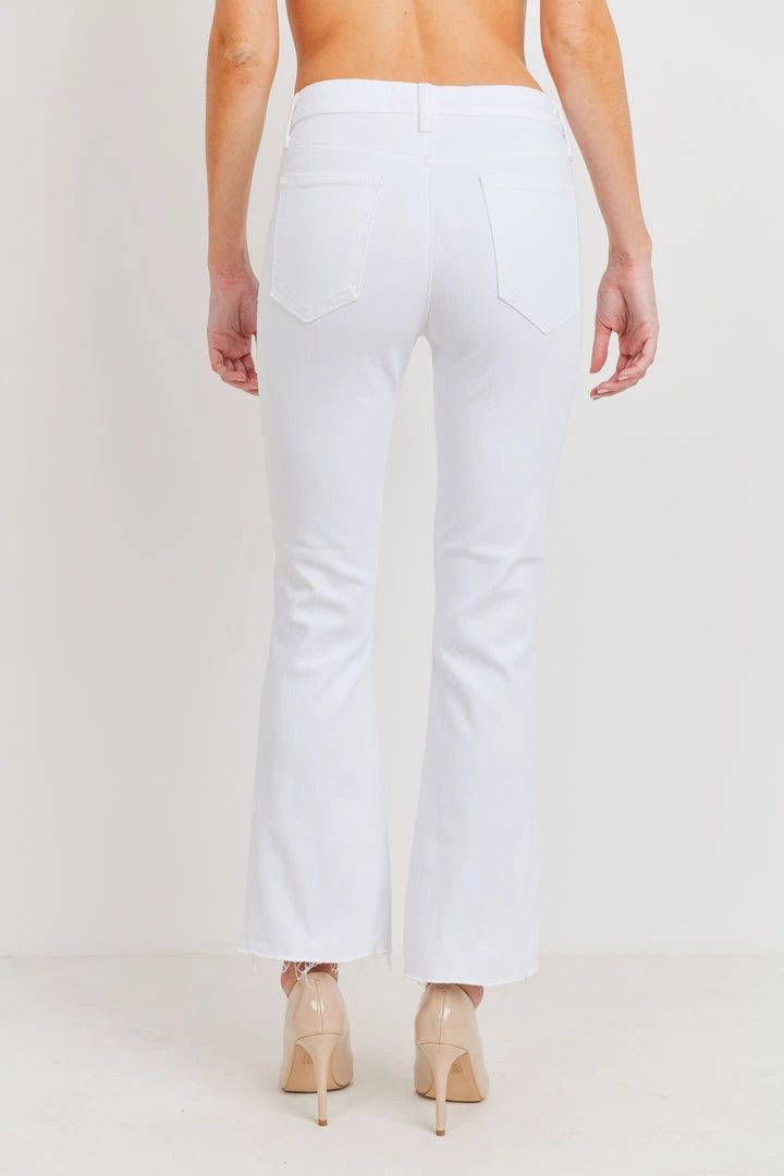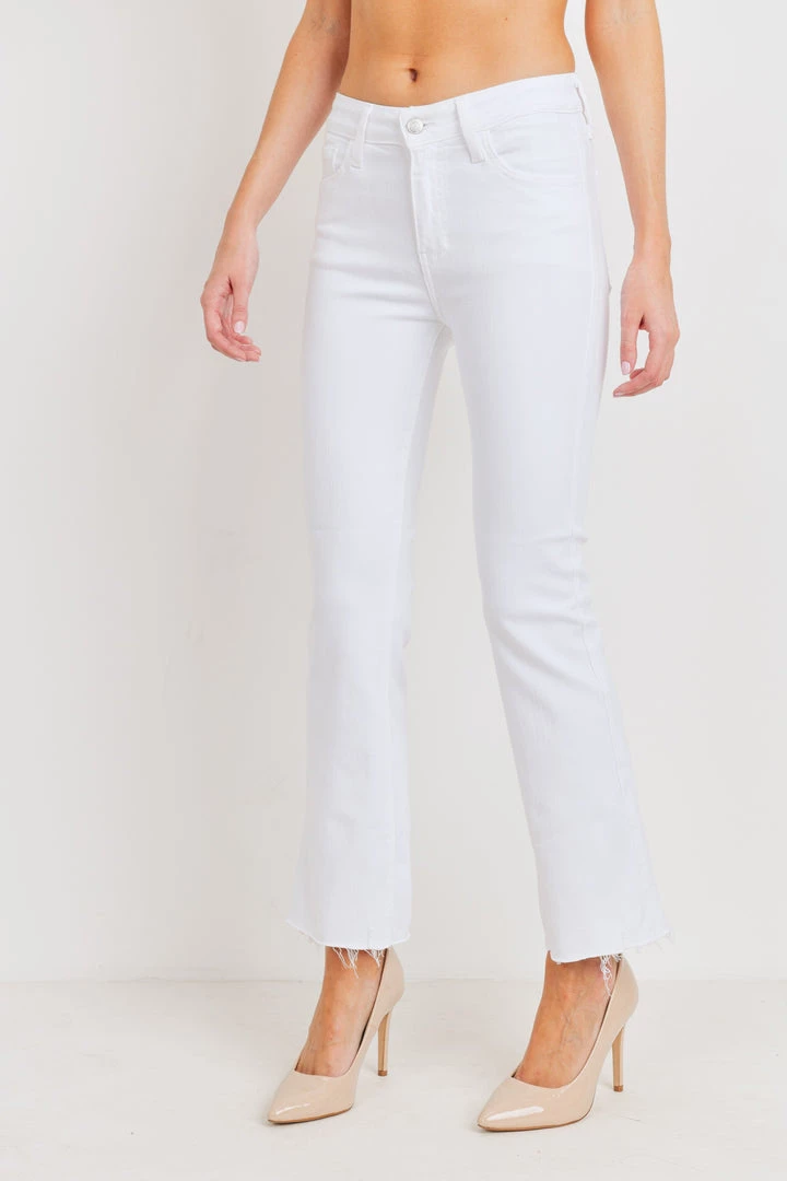 Freshen up your spring wardrobe with these white cropped flares! High waisted and a raw hem gives this jean an updated look. Rise: 10″ Inseam: 26″