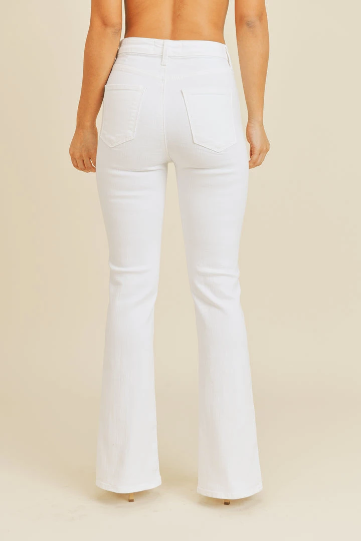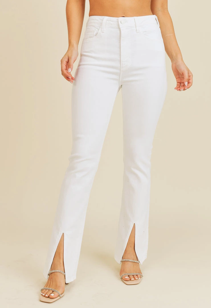 A chic and trendy look to update a classic white jean! These high waisted white flares feature a long front slit. Dress up or dress down. These will become your go-to going out jean! Rise 11″ Inseam 32″