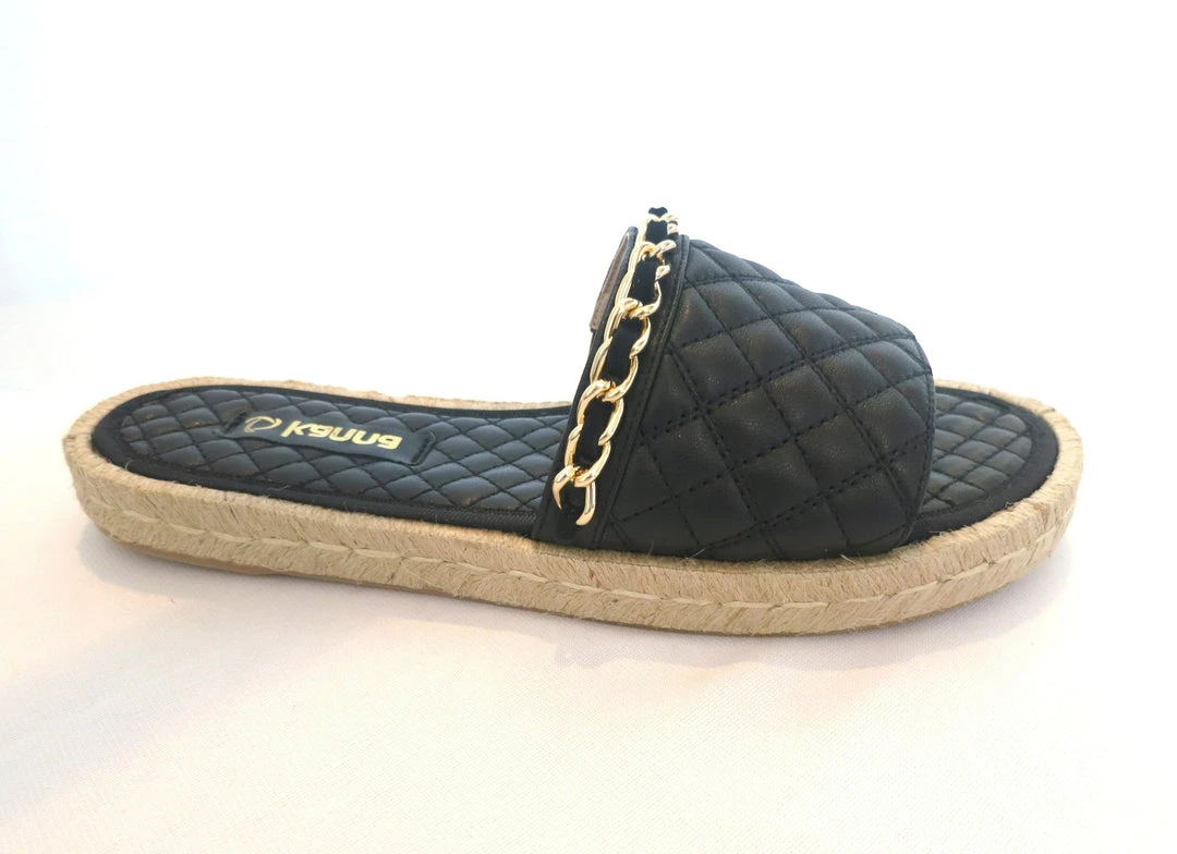 Elevate your look in these quilted flat espadrille sandal with gold chain link detail & quilted leather lining.