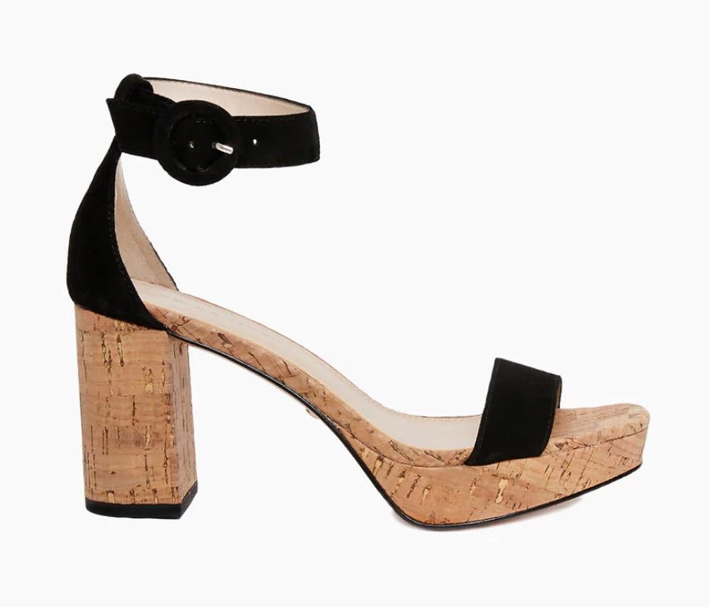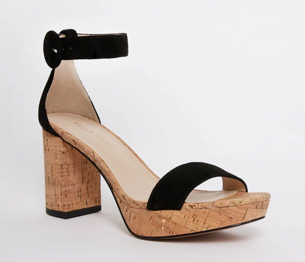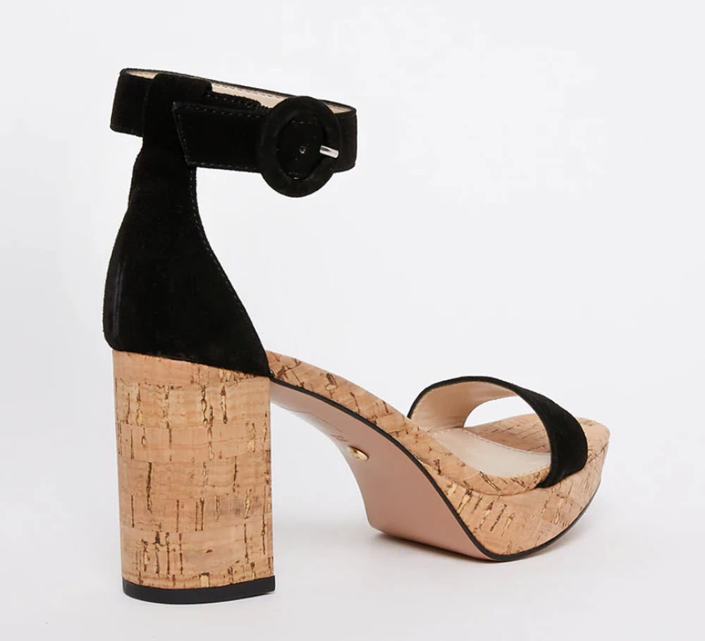 Welcome Spring in a fun platform wrapped in cork. Strut these all year round! These platform heels with ankle buckle closure with a cork heel. Suede upper, leather lining and insole, synthetic outsole. Heel 3 inches. Platform 1 inches.