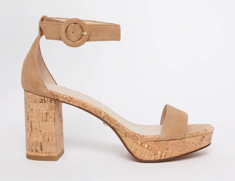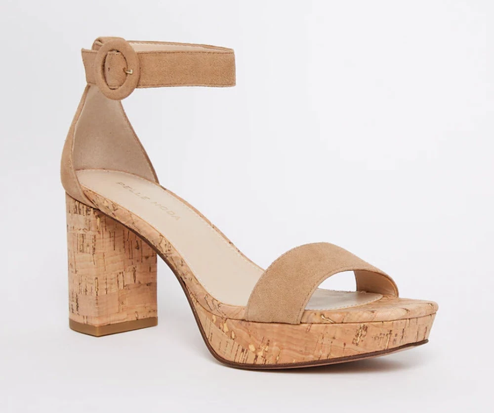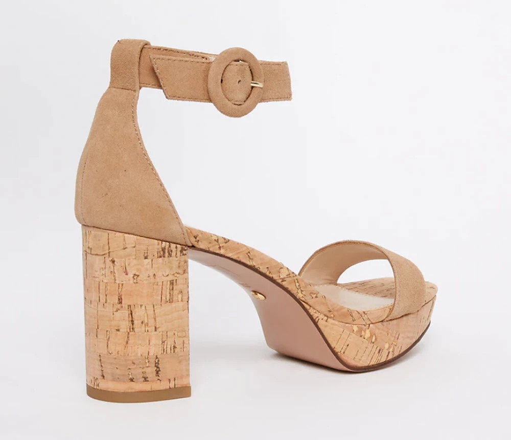 Welcome Spring in a fun platform wrapped in cork. Strut these all year round! These platform heels with ankle buckle closure with a cork heel. Suede upper, leather lining and insole, synthetic outsole. Heel 3 inches. Platform 1 inches.