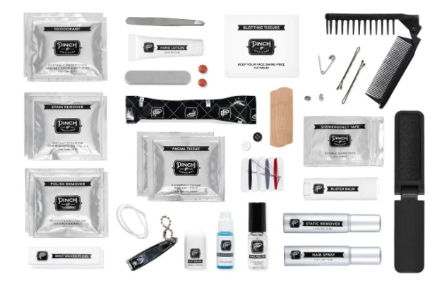 This midsized metallic Shemergency kit features Saffiano style pouch with 40 beauty, personal care, and style essentials. Includes hair spray, folding brush, clear elastics, bobby pins, deodorant towelettes, floss and much more!