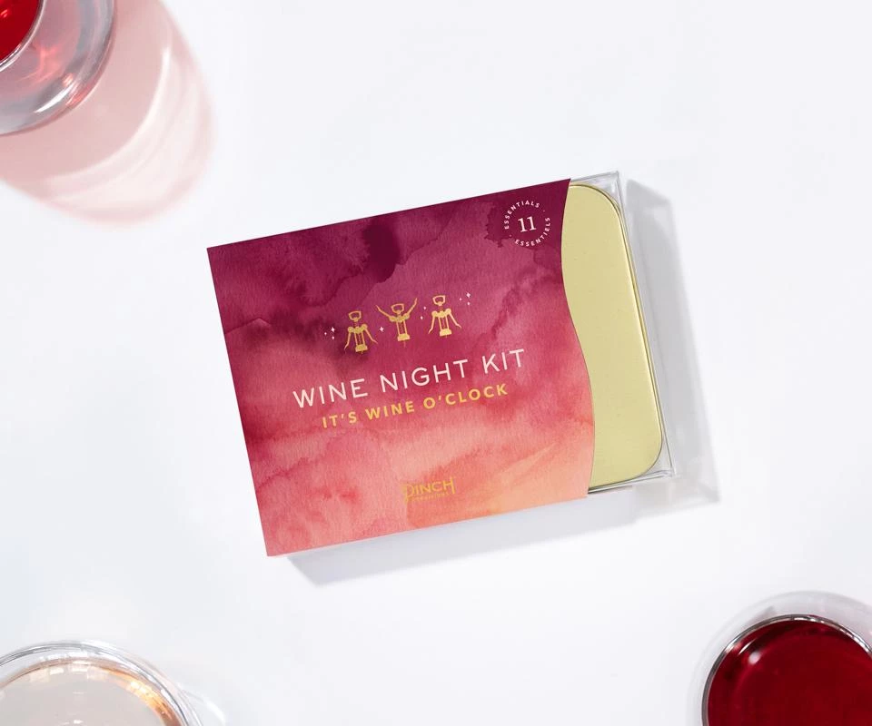 Put your feet up and pour yourself a glass. This wine night kit will get you through the night. Kit includes a wine glass marker, stain removing spray, socks, decision coin, wine removing towelettes, gold-tone wine stopped, and gold tone corkscrew.