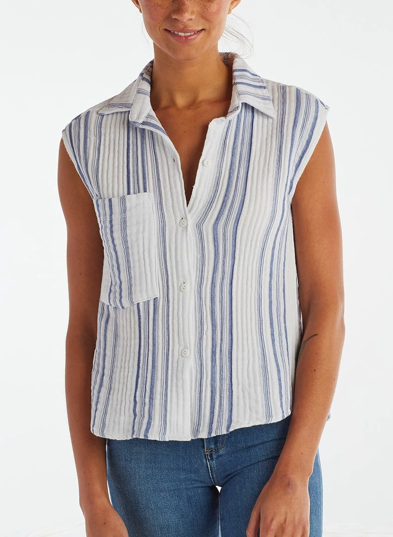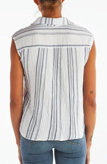 We love summer button downs! This lightweight, gauze, white and blue stripe button down has a loose fit and a front pocket. Just add jeans or shorts!