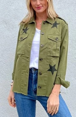 A fun and edgy star jacket that is perfect for transitional weather, this shacket is just the right layering piece for your outfit. Raw hem details and front chest pockets finish off the look.