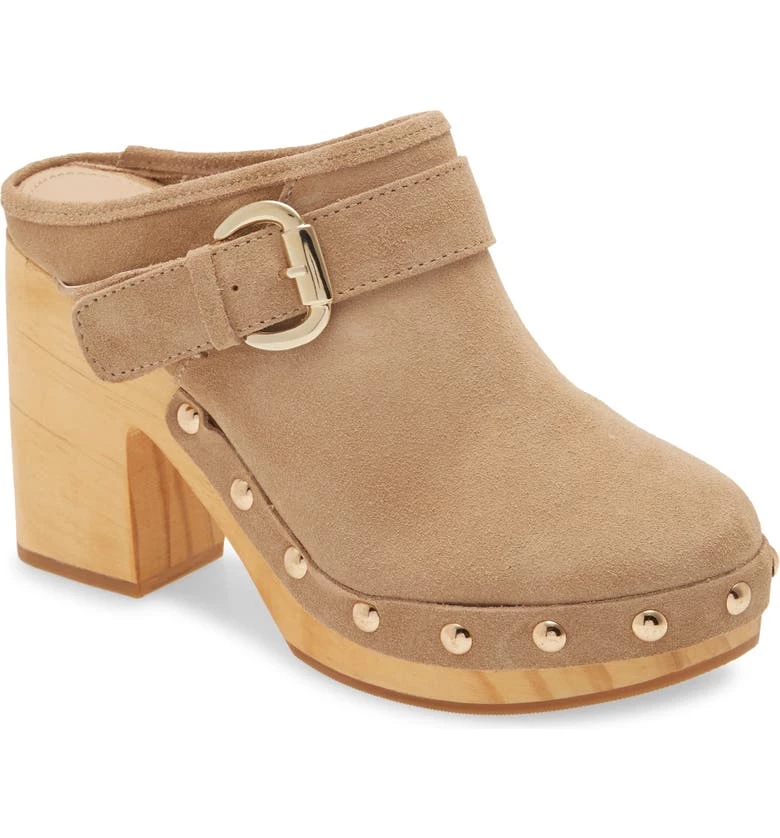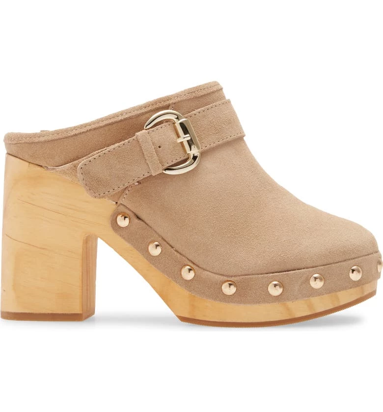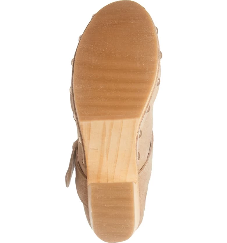 Slip into these elevated belted clogs with silver rivet & buckle detail. Suede upper, wood & rubber sole bottom.