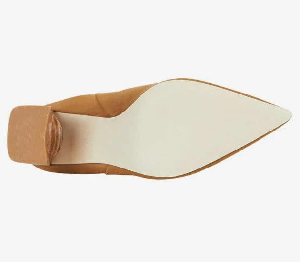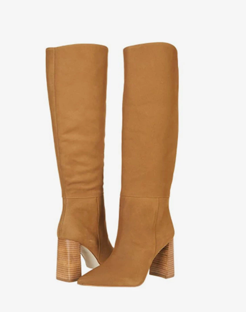 These pointy toe mid stack heel tall boots give a leg lengthening effect. Leather upper and synthetic lining and sole. Heel height 3 1/2 inches. 16 inch shaft and 15 inch calf circumference.