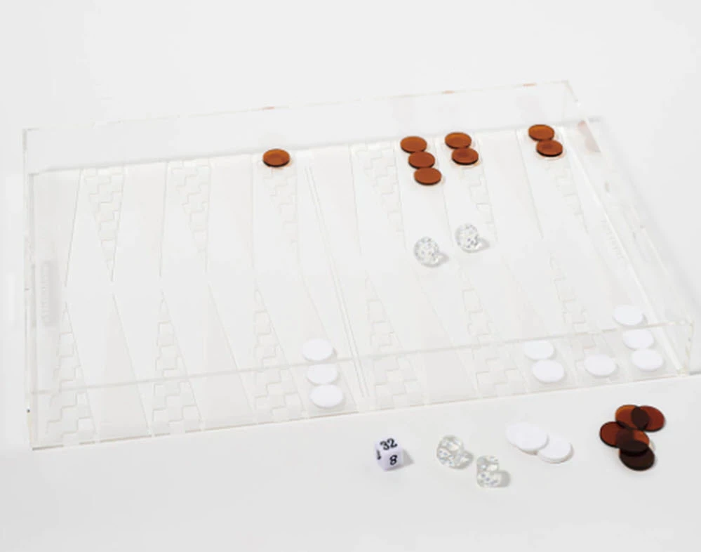 Designed with style in mind! This acrylic backgammon cocktail tray is perfect for entertaining. Includes 15 frosted white playing chips, 15 Sepia playing chips, 4 clear dice, and 1 white numeric dice.