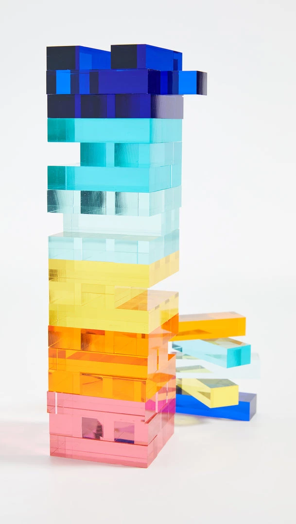 Jumbling tower made of transparent lucite acrylic and includes 54 blocks. Recommended for children 6+.