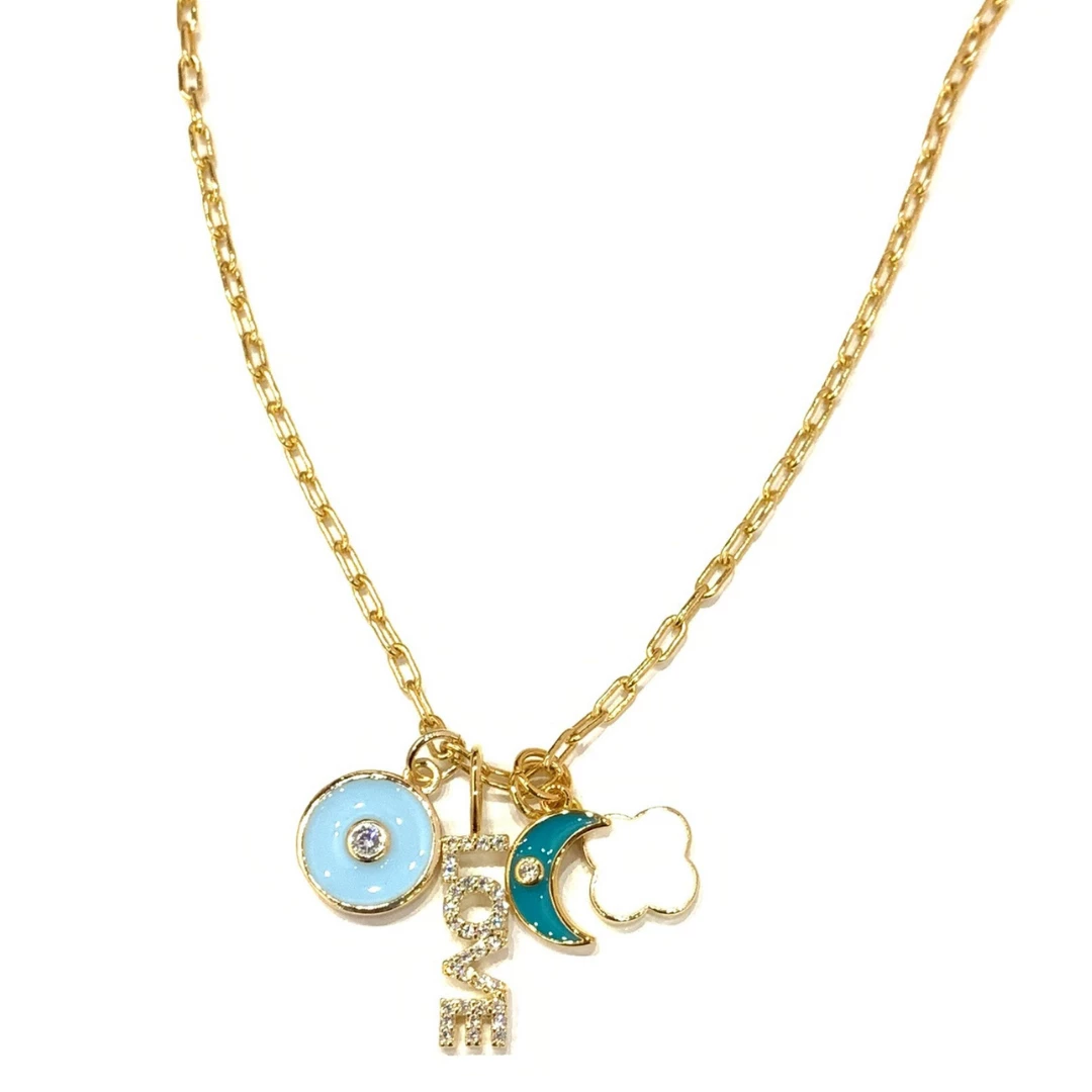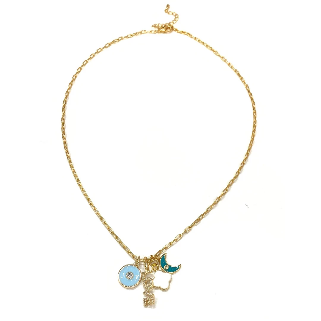 A fun a trendy necklace with delicate charms that gives any outfit a fun pop! Measures 16-18″ adjustable.
