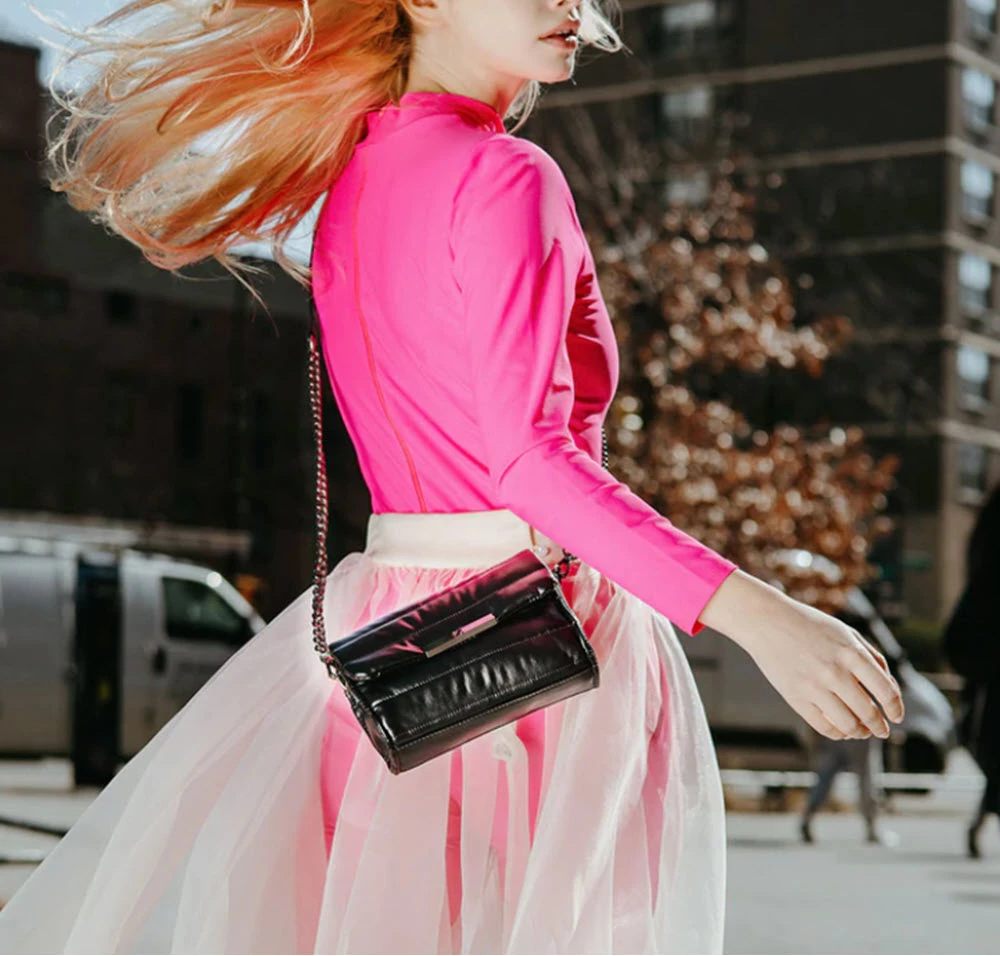 Experience an instant wardrobe upgrade with this small chain crossbody! Back slip outside pocket and side slip and zip inside pockets. Includes detachable chain strap.