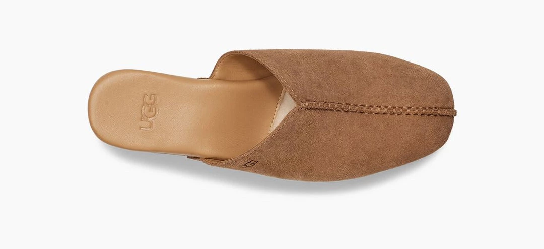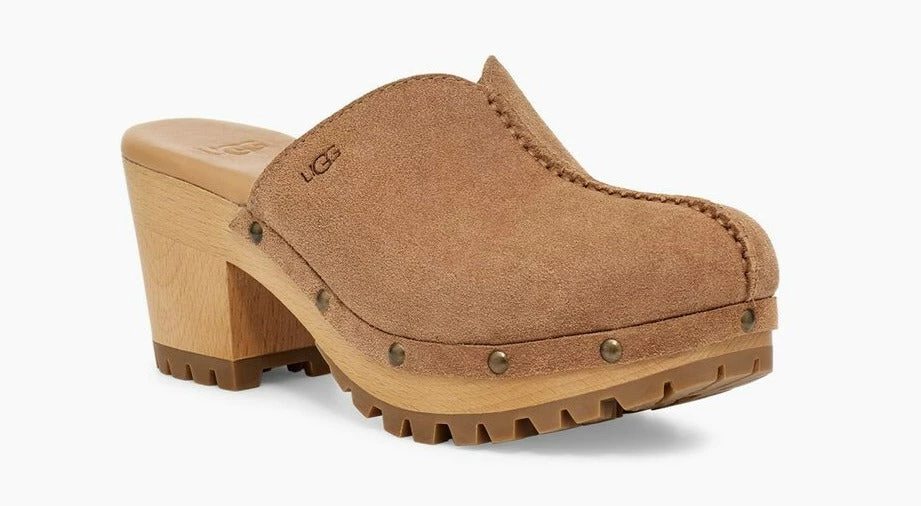 This traditional wood clog with center split seam & nail head details, features the UGGplush & sheepskin lining on half of the innersole for a cozy feel. Suede upper,cushioned sock lining, wooden clog, rubber lug sole. 2.75″ height. American whole size only.