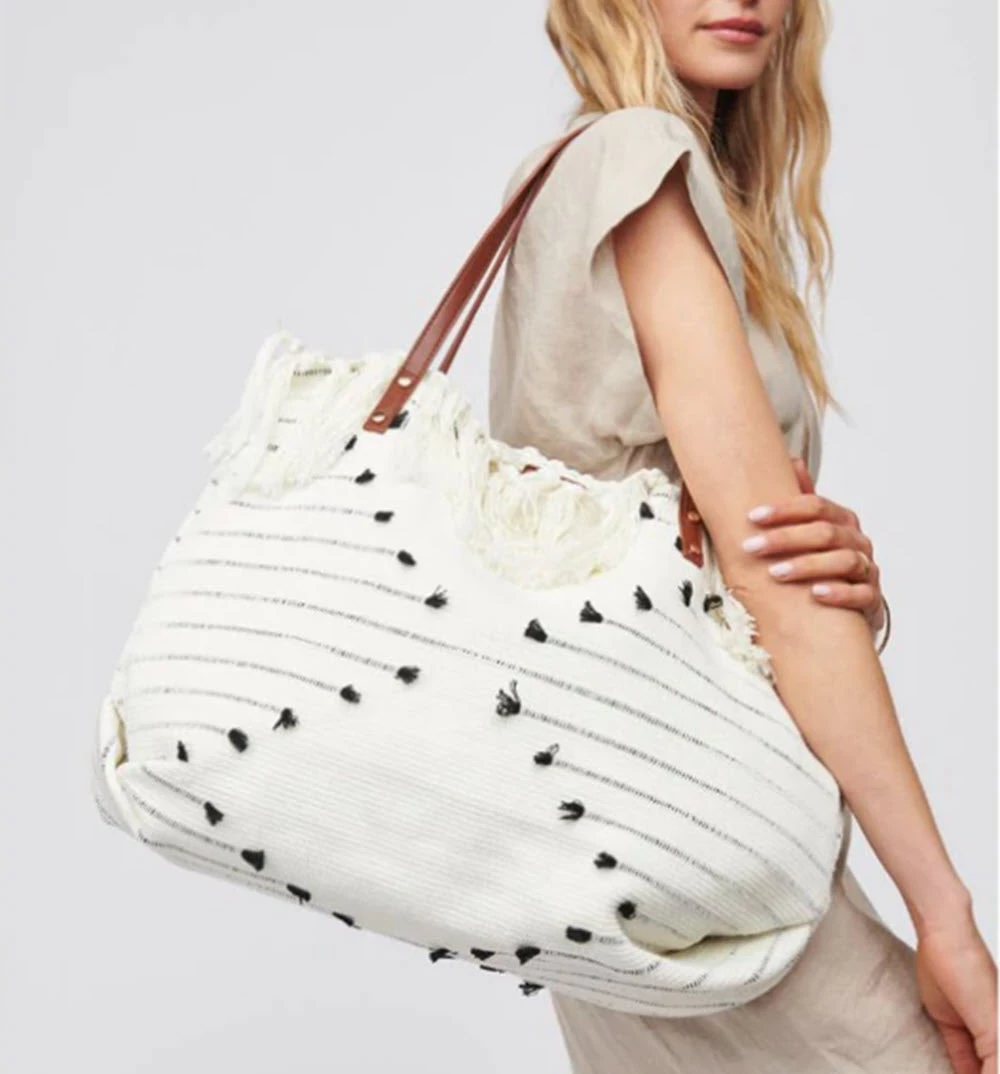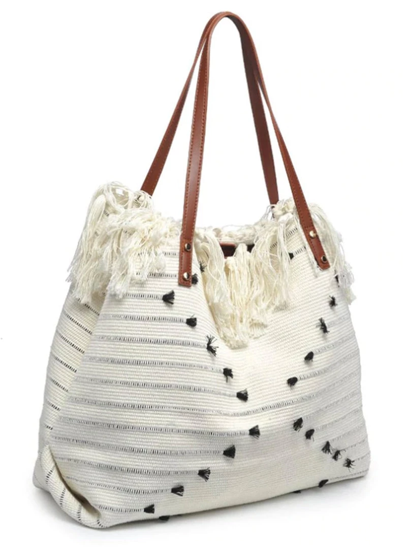 Carry everything you need in this fringe woven tote. Vegan leather trim and gold hardware. One interior zipper pocket and snap closure.