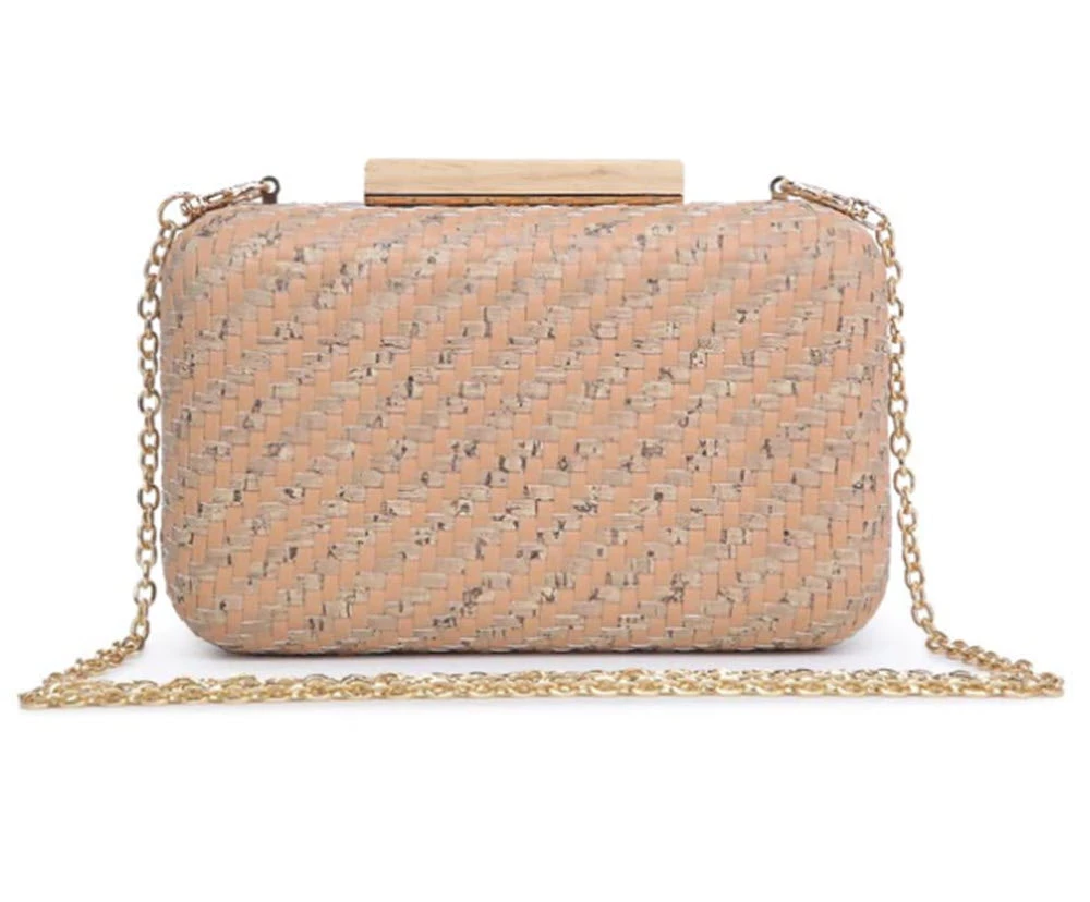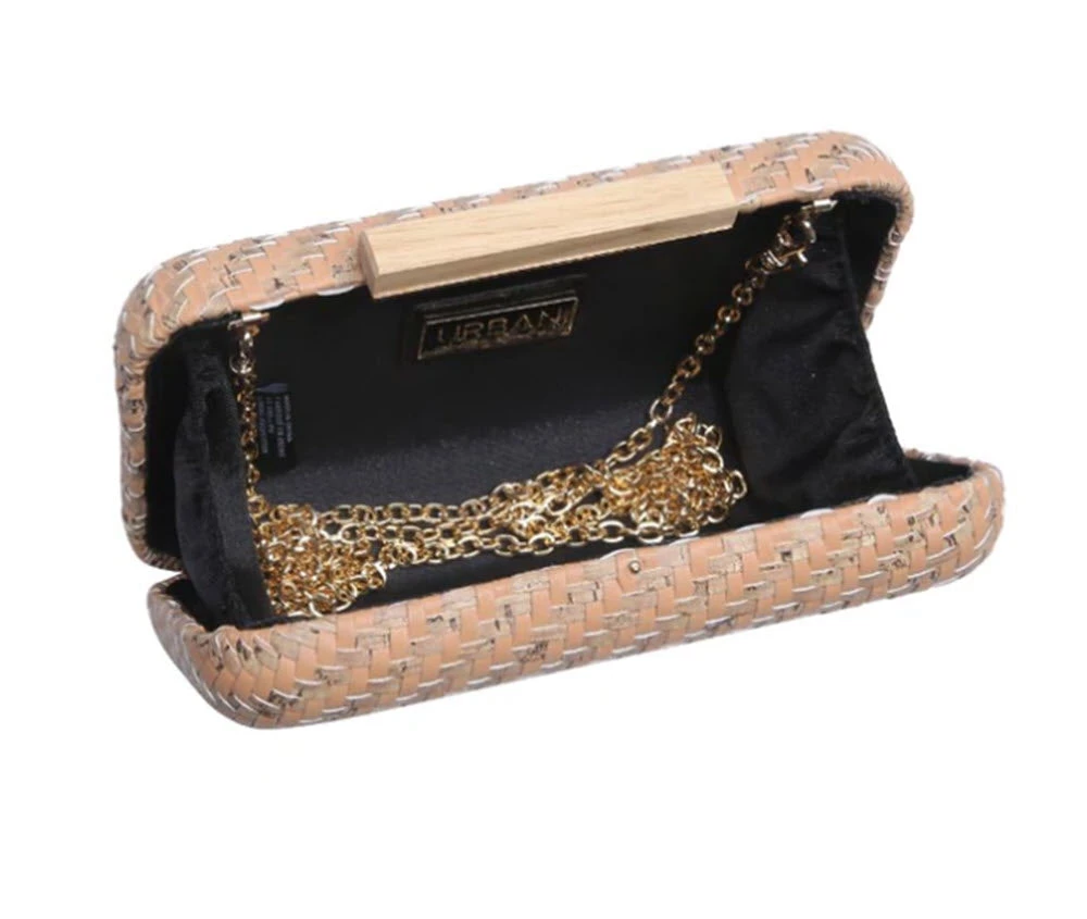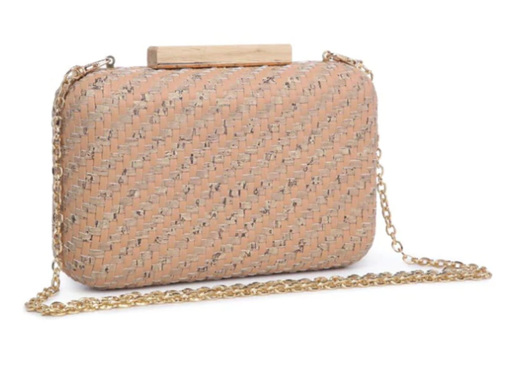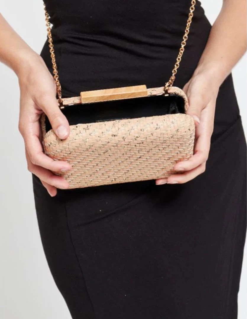 Clutch with woven vegan leather and cork pattern and wooden top clasp. Fabric lines, open compartment, and detachable chain strap.