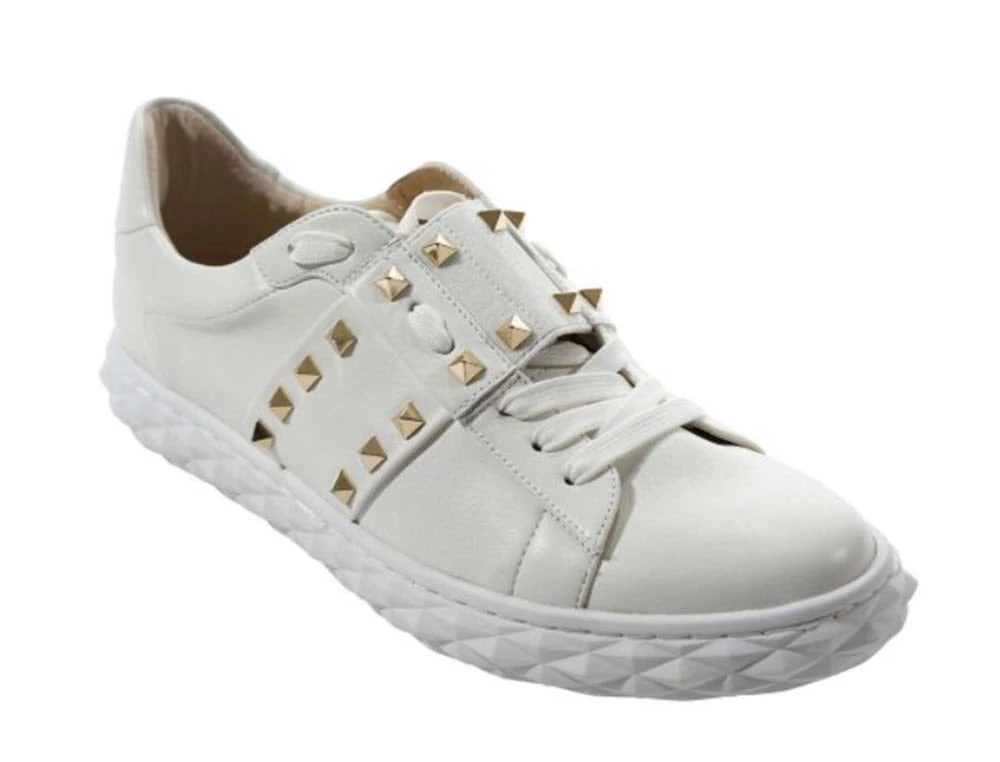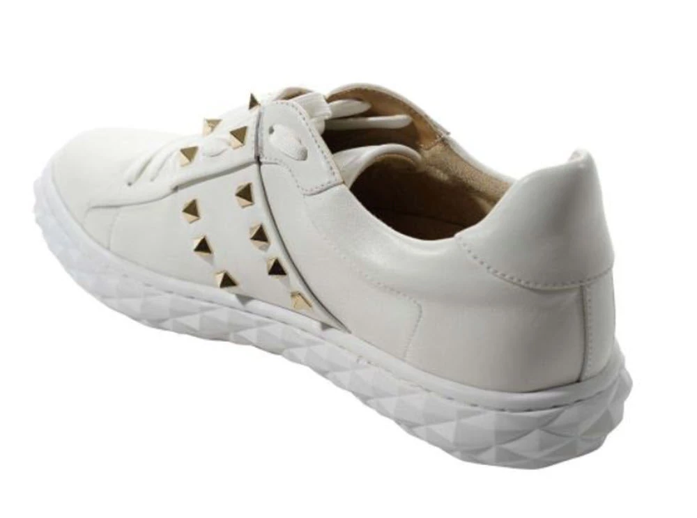 This classic white sneaker is upgrade with pyramid studs and quilted textured midsole. Elastic strap over lace stay and padded removable insole. Sole 1 inch.