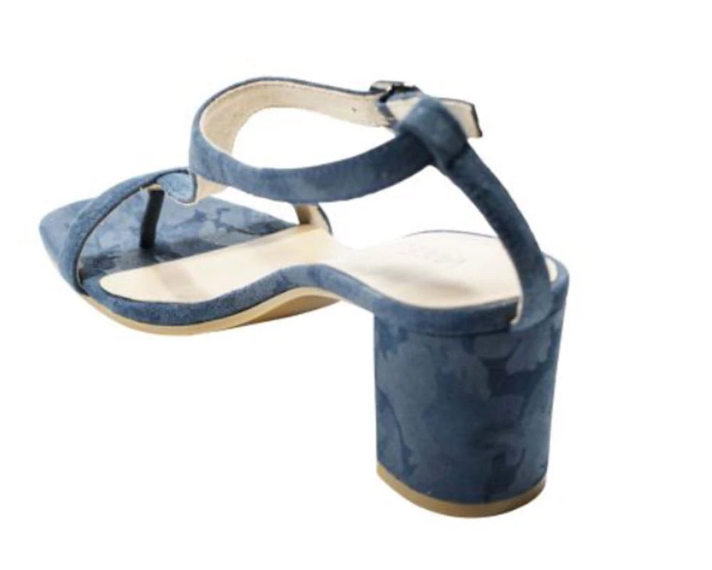 Posted thong t-strap sandal on block heel. Cushioned footbed, suede upper and lining, and rubber sole. Heel 2 1/2 inches.
